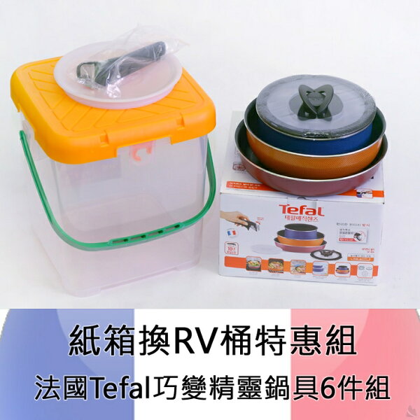 本特惠組包含一個RV收納桶(上蓋顏色隨機出貨),Tefal鍋具六件組會放入RV桶內後包裝出貨,鍋具的彩盒紙箱店家回收,不會提供您,如果您想要原廠紙箱商品,請分別訂購所需單品,但不享優惠。